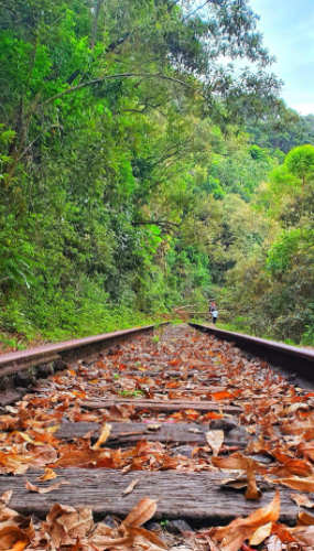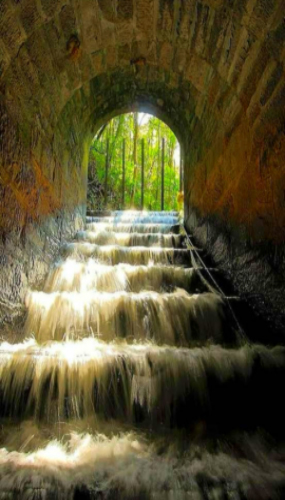 Construção em pedra em forma de arco com chão de degraus abaixo da linha férrea onde passa o afluente do Rio Benevente.